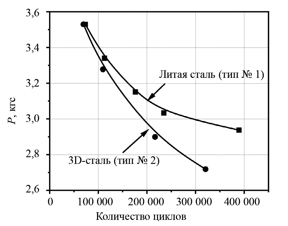 На рис. 1 показаны кривые усталости для образцов литой (тип № 1) и 3D-стали (тип № 2) 09Г2С. В эксперименте было доведено до разрушения 5 образцов из литой стали и 4 образца из 3D-стали. Из рис. 1 видно, что при максимальной нагрузке количество циклов до разрушения для образцов из литой и 3D-стали совпадает, а при меньших нагрузках кривая для 3D-стали идет ниже, поэтому прогнозируется, что предел выносливости 3D-стали будет меньше, чем у литой стали 09Г2С.