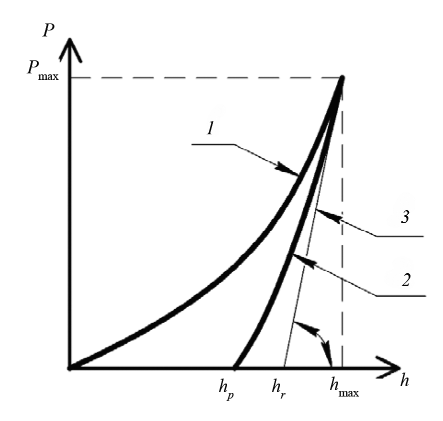 Рис. 1. Диаграмма контактное усилие — глубина внедрения для способа ИИ: 1 — кривая нагружения; 2 — кривая разгружения; 3 — касательная к кривой 2 при Fmax.