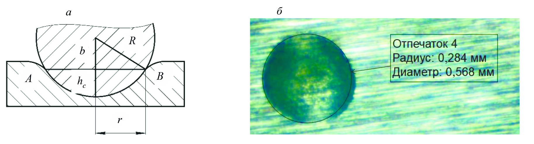 Рис. 2. Параметры отпечатка при индентировании: а — упрощенное изображение продольного сечения зоны отпечатка и индентора; б — фотография получаемого отпечатка.