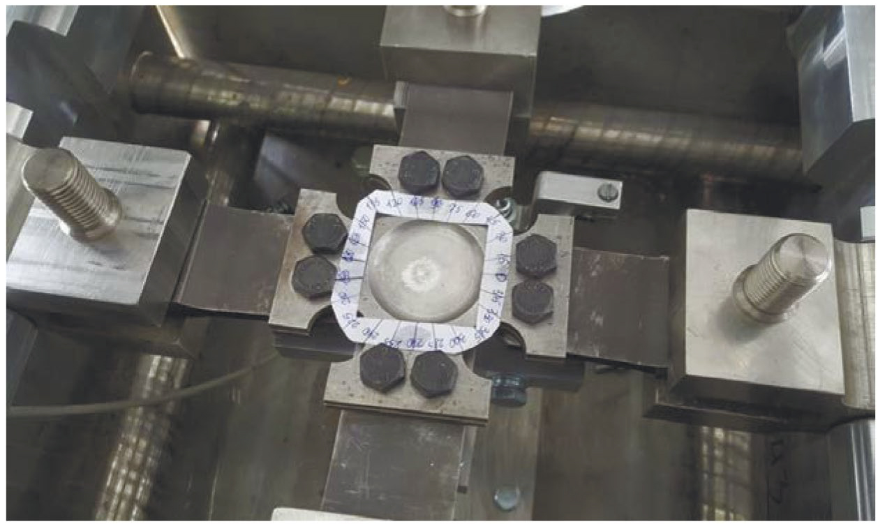 Для исследований влияния напряжений и деформаций при плоском напряженном состоянии на магнитные характеристики из каждой стали были изготовлены крестообразные образцы. С целью обеспечения деформирования преимущественно центральных участков образцов с одной стороны образцов в центре были фрезерованы круговые выборки диаметром 50 мм и галтелями радиусом 5 мм. Толщина центральной части образцов каждой стали составляла 1 мм. При испытаниях составного образца их компоненты плоскими сторонами соединяли болтами в районе головок образцов.