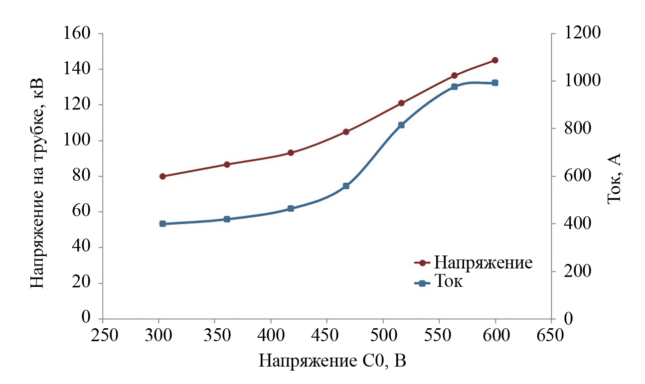 Рис. 2. Зависимость максимумов напряжений и токов импульсной рентгеновской трубки от напряжения на первичном накопителе.
