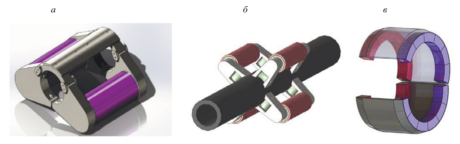Рис. 2. Трехмерные модели намагничивающих систем: а — распашной с воздушным зазором 5 мм; б — с ферромагнитными колесами; в — с постоянными магнитами NdFeB с воздушным зазором 10 мм.
