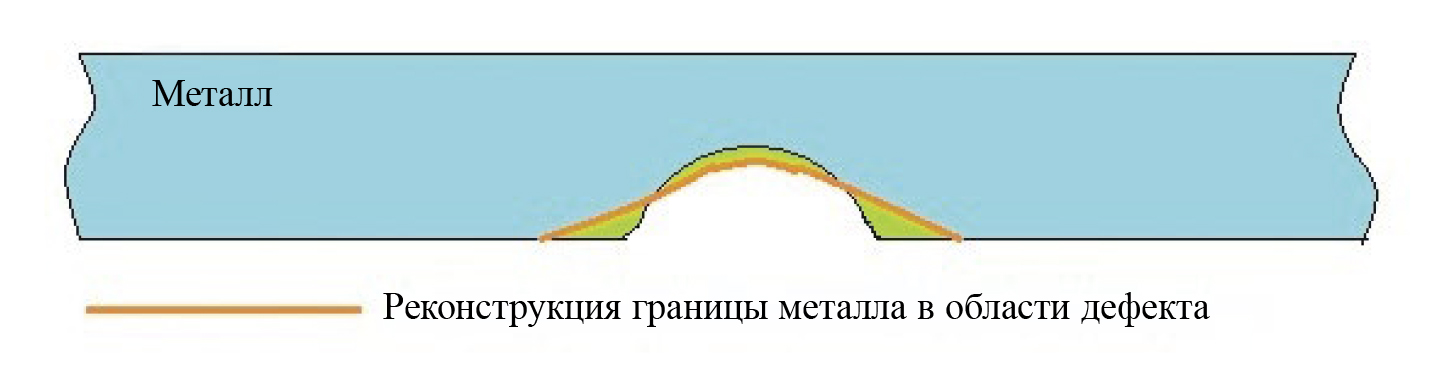 Рис. 5. Поперечное сечение пластины. Реконструкция формы дефекта выполнена с учетом его реальных размеров на поверхности пластины.
