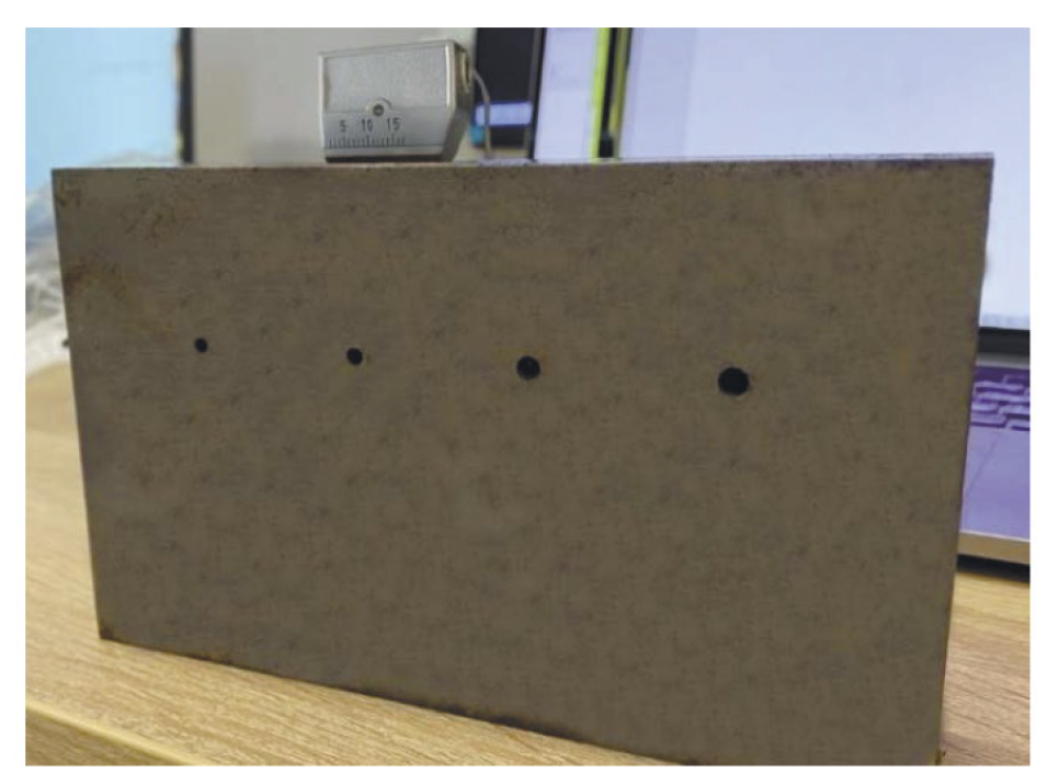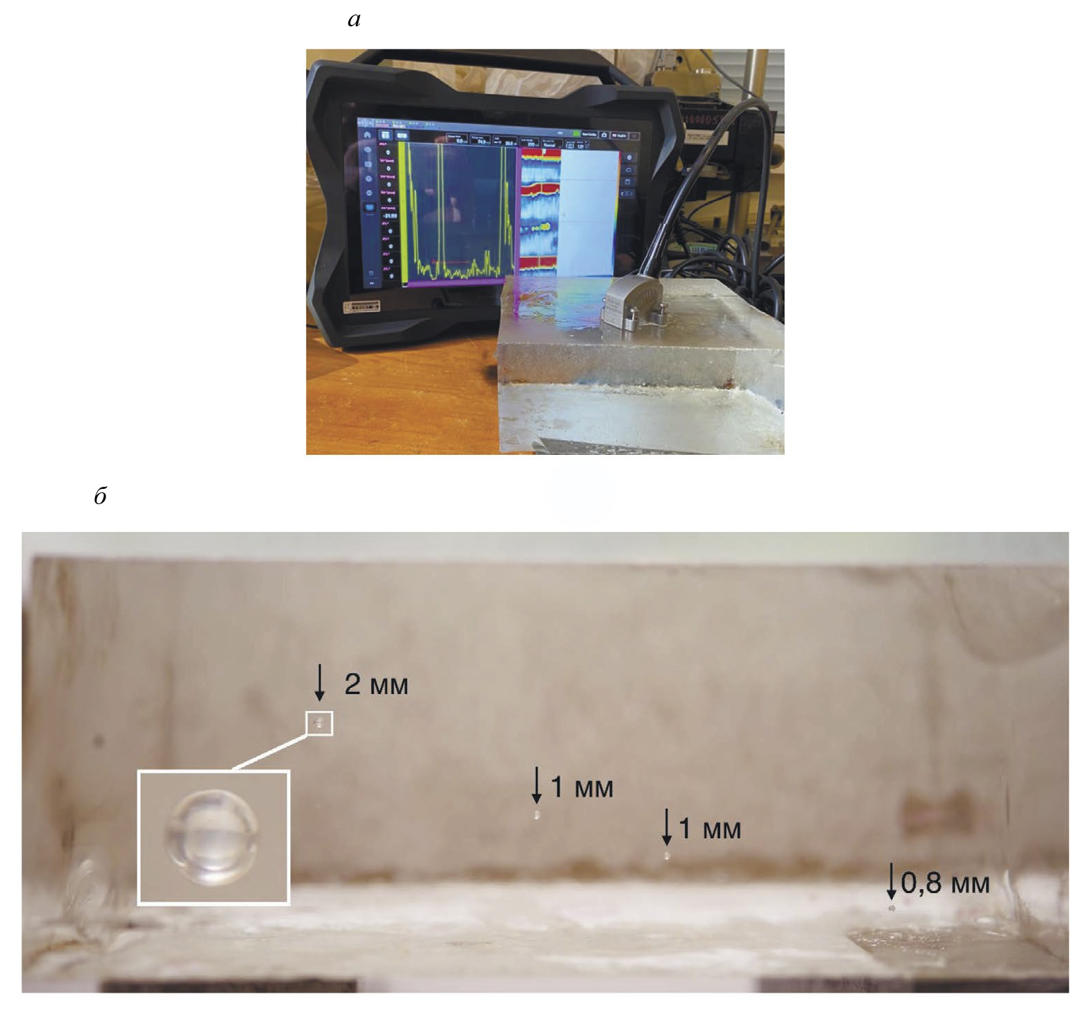 Рис. 1. Блок толщиной 61,5 мм из стекла с порами: общий вид при измерениях (а); фотография пор с торца образца (б)