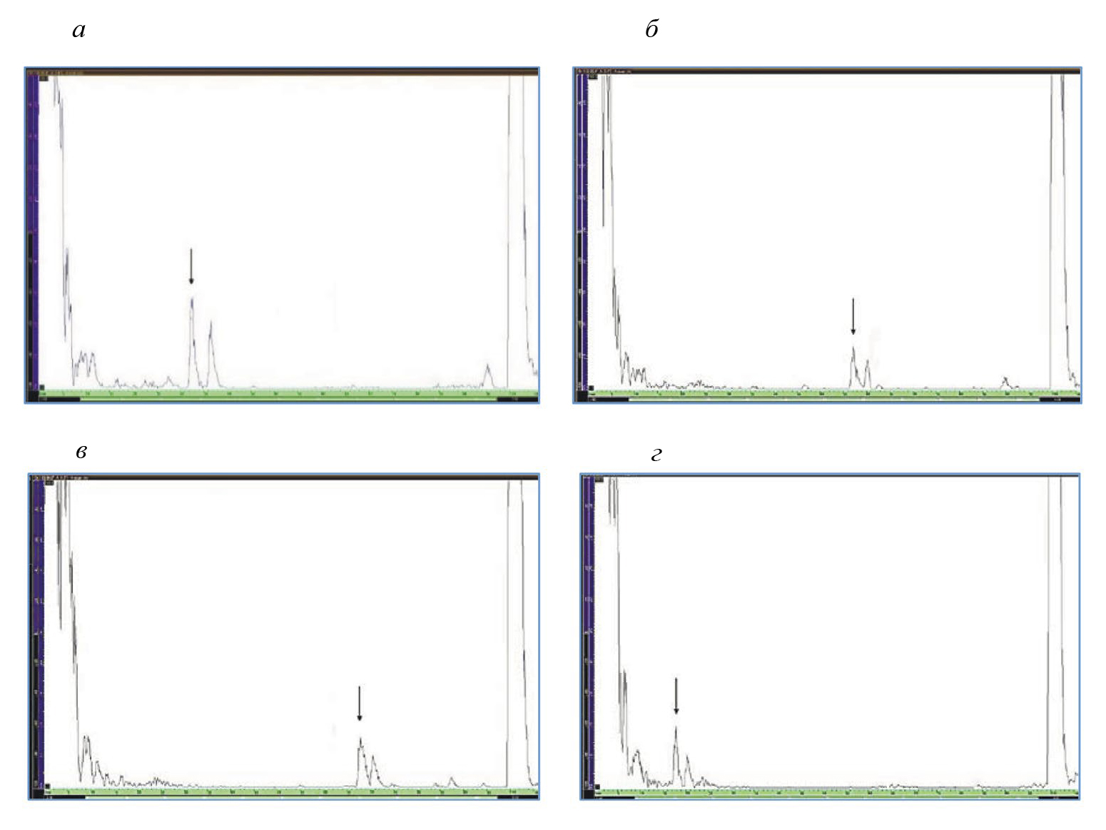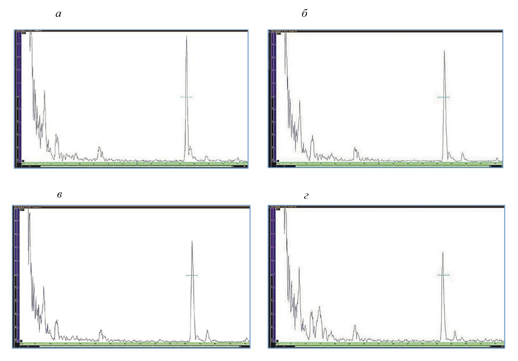 Рис. 3. А-сканы при выявлении в блоке из стекла поперечными волнами пор диаметром: 2 мм (а); 1,0 мм (б); 1,0 мм (в); 0,8 мм (г) (для поры Ø0,8 мм — измерения в направлении против стрелки на рис. 1б)