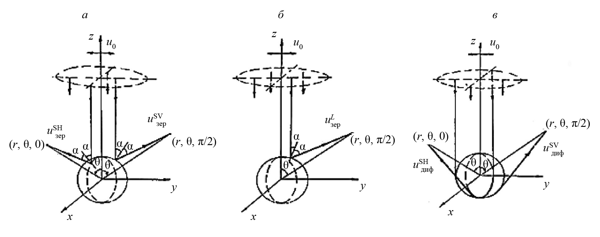 Рис. 5. К рассеянию линейно поляризованной поперечной волны u0 на сферической полости: отражение , , трансформация по законам геометрической акустики (а, б); огибание полости , (в)