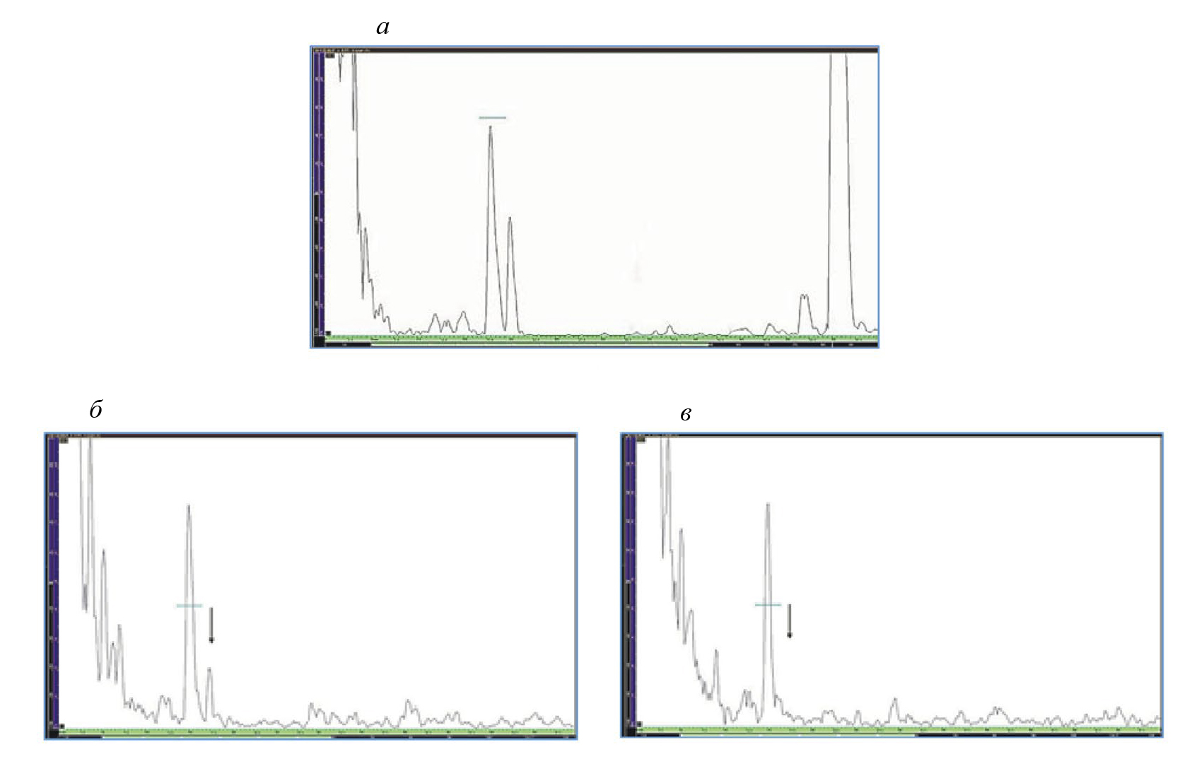 Измеренная скорость продольных cL и поперечных cS волн в использованном образце из стекла составила 5,72×103 и 3,67×103 м/с соответственно, т.е. cS / cL = 0,64. Исходя из этого, с учетом времени приема сигналов, расположения ПЭП и динамики изменения сигналов при сканировании по поверхности образа сделан однозначный вывод о том, что это — сигналы от пор. Необходимо отметить, что при прозвучивании поперечной волной в направлении стрелки на рис. 1б, пора диаметром 0,8 мм практически не выявлялась — сигналы затухали при расстоянии 50,5 мм от поверхности образца. Поэтому на рис. 3г приведен А-скан сигнала, полученный от этой поры с расстояния 11,0 мм от ближней к ней поверхности образца, т.е. против стрелки на рис. 1б. В результате, сигнал от этой поры на развертке находится ближе к зондирующему импульсу, чем сигналы от других пор (см. стрелки на рис. 3).