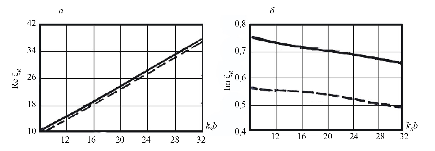 Рис. 11. Действительная и мнимая части комплексного волнового числа скользящих волн релеевского типа на сфере (сплошные линии) и цилиндре (штриховая линия): действительная часть (а); мнимая часть (б)