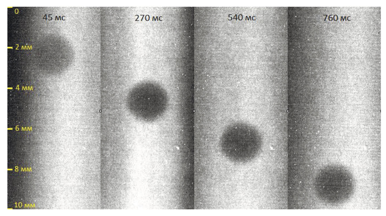 Протонно-радиографическое изображение формировалось на сцинтилляционном детекторе CsI:Tl в виде пластины 120×120 мм2 и толщиной 6 мм и регистрировалось с помощью цифровой камеры PCO DIMAX. Режим работы цифровой камеры позволял получить серию из 45 кадров с экспозицией 40 мс каждого кадра и временем задержки между кадрами 5 мс. При обработке экспериментальные данные брались из одного цикла нагрева. На рис. 3 показано несколько протонно-радиографических изображений, полученных в различные моменты времени от начала падения шарика в расплаве серы. Как видно из графика, приведенного на рис. 4, движение шарика носит равномерный характер.