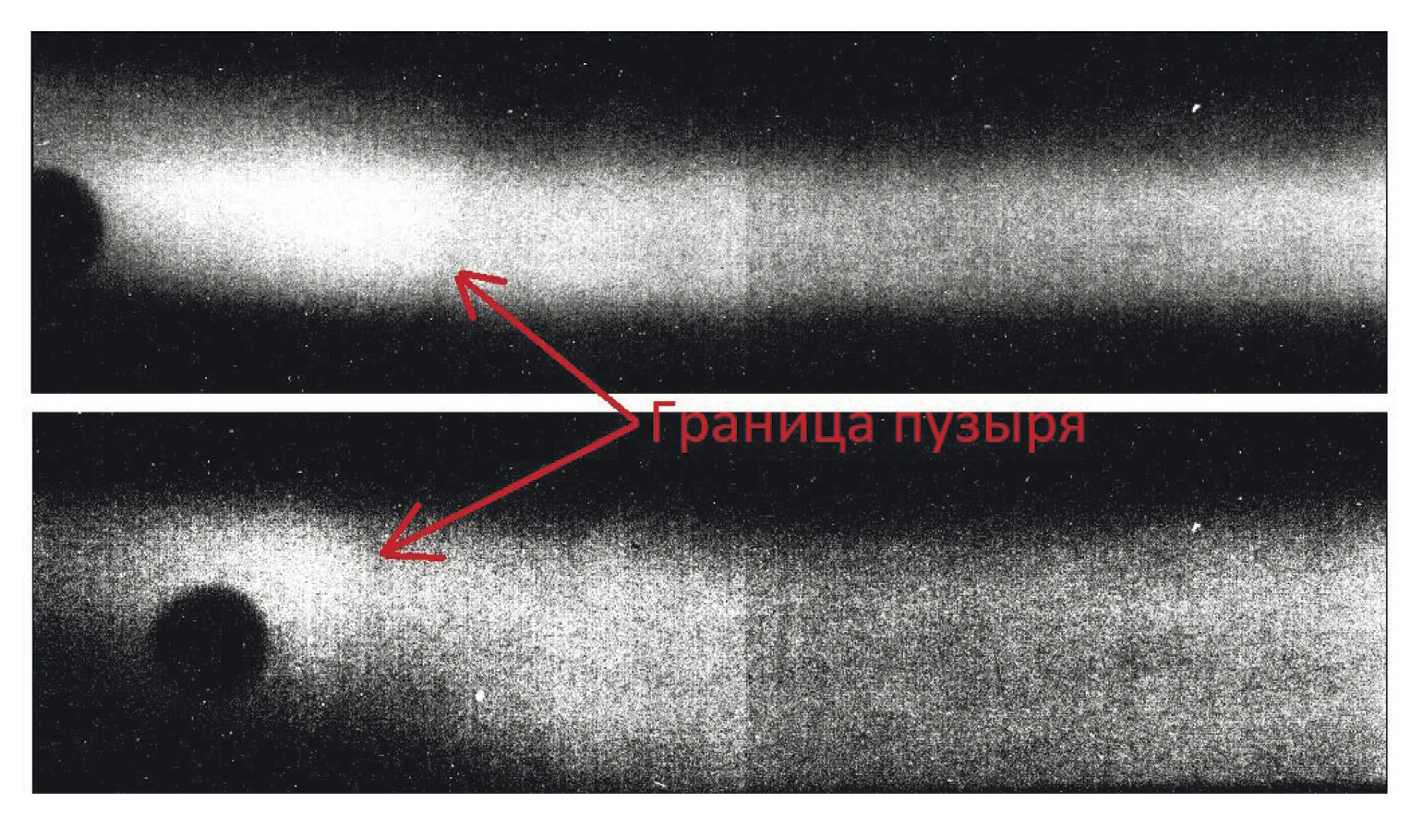 Рис. 7. Протонно-радиографические изображения расплава серы в различные моменты времени. Стрелками обозначены граница пузыря