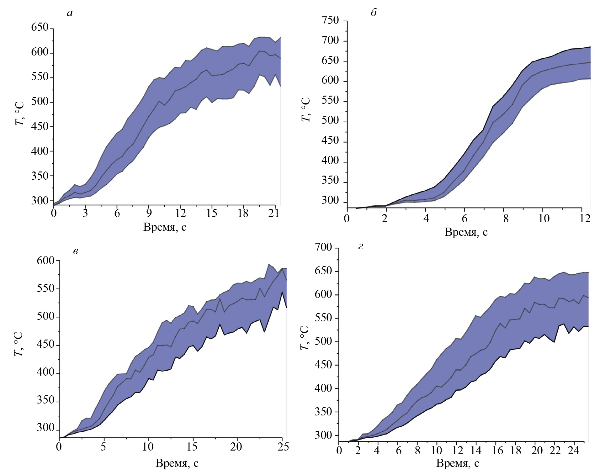 В результате были получены кривые, представляющие процесс нагрева поверхности исследуемых конструкций (рис. 4). Три линии, показанные на графиках, представляют собой изменение усредненной температуры, которая совпадает с соответствующей горизонтальной линией на термограмме (см. рис. 3). Область, закрашенная между линиями, показывает диапазон изменения температуры.