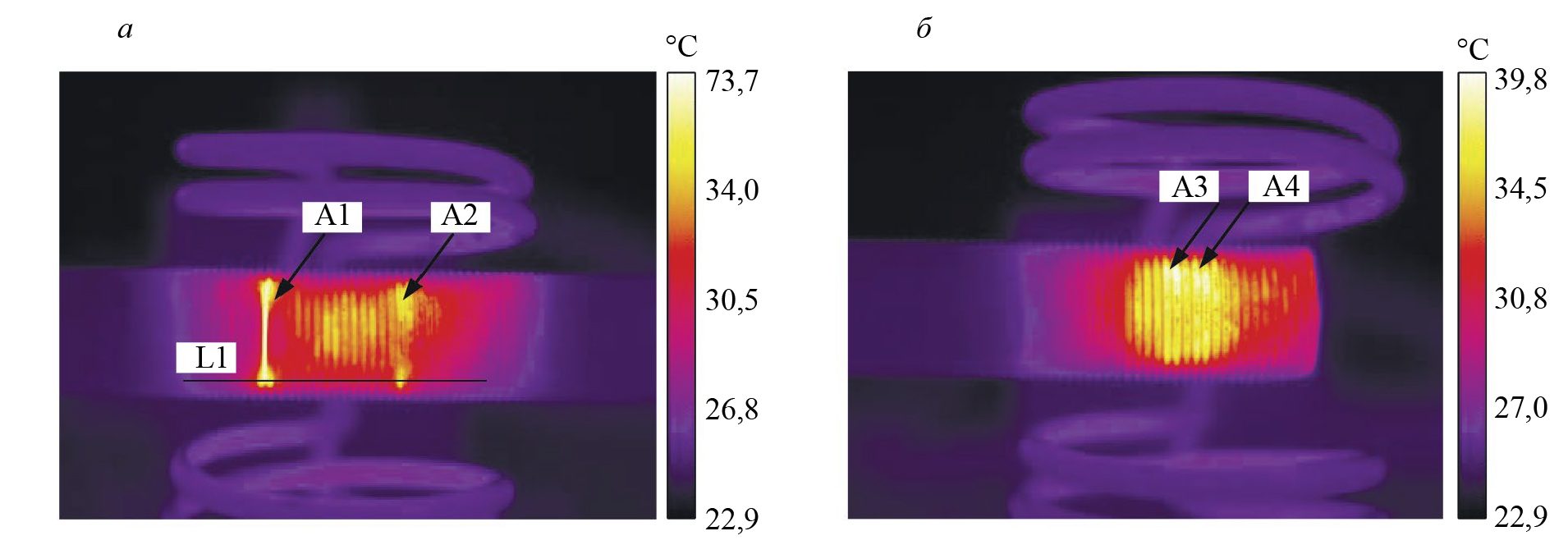 Во время проведения исследования методом ЭМТ для болта А ток возбуждения и длительность возбуждения были установлены равными 220 А и 300 мс. На рис. 4 представлены термограммы трещин A1, A2, A3 и A4, снятые через 0,3 с. Из рис. 4 видно, что резьбовая поверхность не демонстрирует явных признаков чередования высоких и низких температур из-за малого шага резьбы болта А. На рис. 4a можно четко определить наличие трещины A1. Наличие трещины приводит к появлению сильных искажений индуцированного вихревого тока, в результате чего в месте трещины возникает большое количество вихревого тока, что приводит к выделению большего количества джоулева тепла в месте трещины. Характер воздействия высокой температуры на трещину A2 не является очевидным по сравнению с трещиной A1. Трещины A3 и A4 на рис. 4б трудно различимы из-за меньшего размера дефекта.