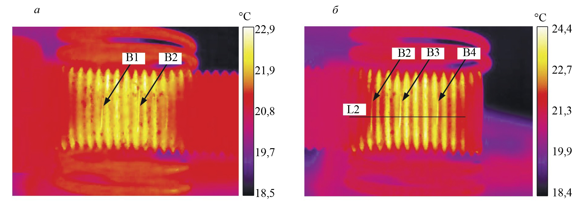 Для болта В ток возбуждения и длительность возбуждения были установлены равными 220 А и 300 мс. На рис. 5 представлены термограммы трещин B1, B2, B3 и B4, снятые через 0,3 с. Из рис. 5 видно, что на поверхности резьбы наблюдается чередование относительно высоких и низких температур, т.е. выступы резьбы имеют более высокие температурные показатели, а впадины резьбы имеют низкие температурные показатели. Трещины B1, B2, B3 и B4 демонстрируют очевидные высокотемпературные показатели. Трещина B4 меньше, чем трещина A4, но ее все равно можно идентифицировать. Причина этого явления может заключаться в том, что болт B имеет больший шаг резьбы.
