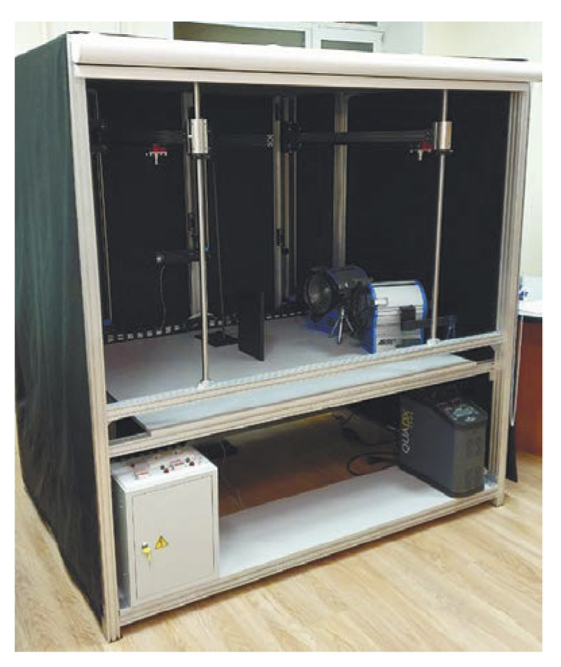 Использована процедура классического одностороннего теплового контроля. Оптический нагрев образца осуществляли с помощью двух галогенных ламп общей мощностью 2 кВт (рис. 2). В большинстве случаев длительность нагрева составляла 15 с. Термограммы образца записывали с помощью тепловизионного модуля Optris PI 450 с частотой 5 Гц в течение 120 с.
