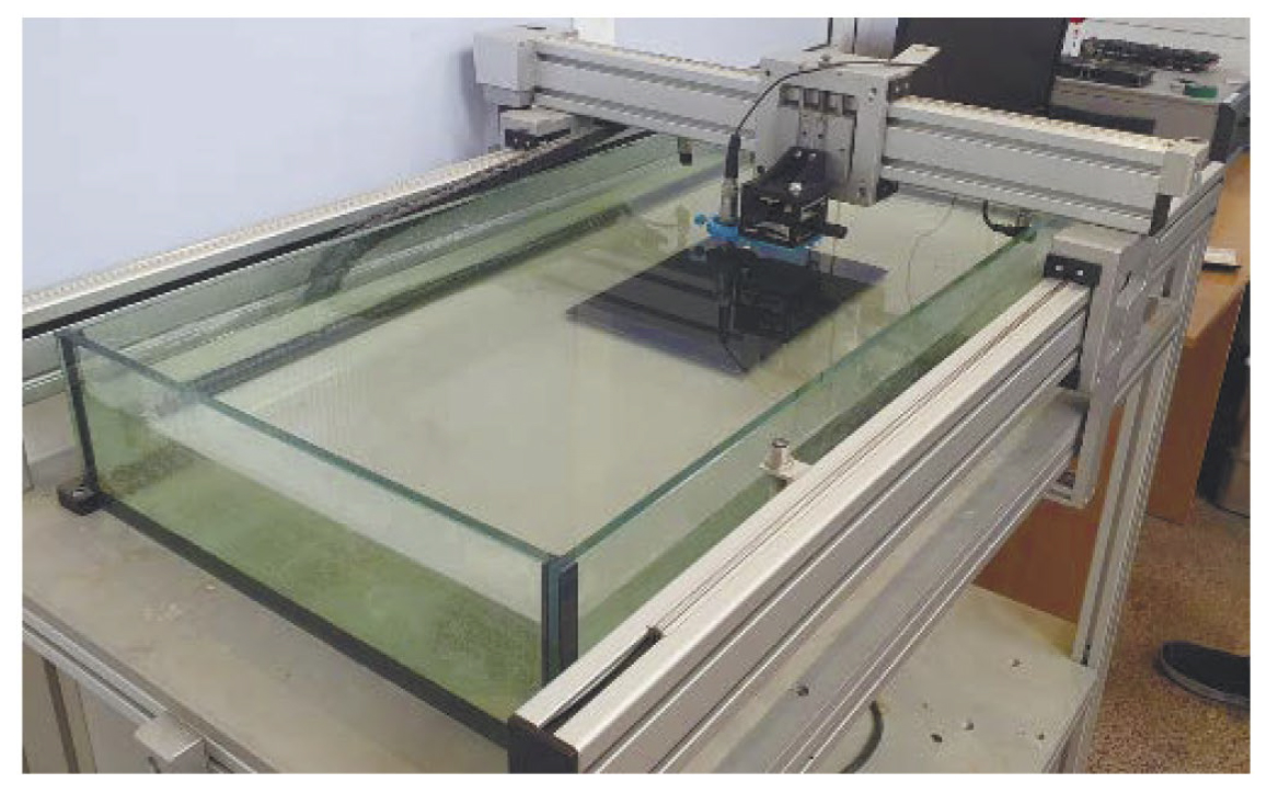 Для автоматизированного акустического контроля с применением эхометода применяли лабораторную установку, представленную на рис. 3. В качестве УЗ преобразователя применялся датчик Olympus A306S-SU с рабочей частотой 2,25 МГц и диаметром пьезоэлемента 13 мм. Указанный преобразователь размещали на движущейся платформе, что обеспечивало двухмерное сканирование по траектории меандра с шагом 1 мм.