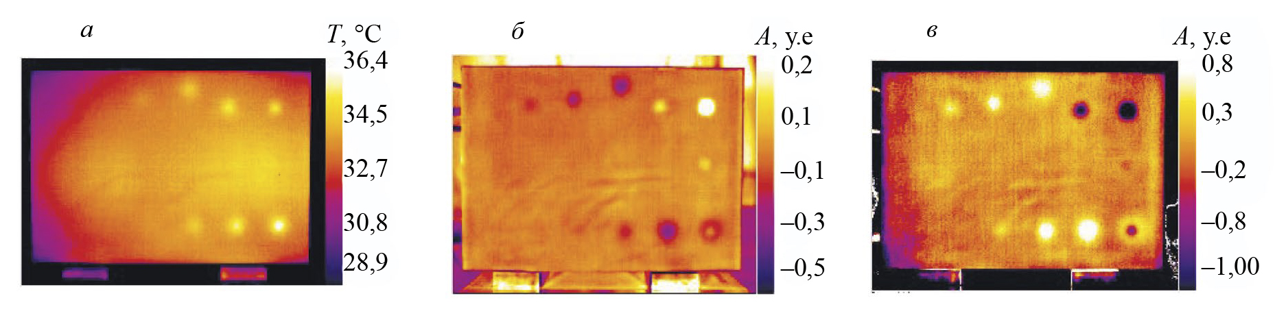 Рис. 4. Результаты ТК контрольного образца (односторонняя процедура, нагрев 15 с): исходная термограмма при 40 с (а); PCA-изображение (3-я компонента) (б); TSR-изображение (1-я производная) (в).
