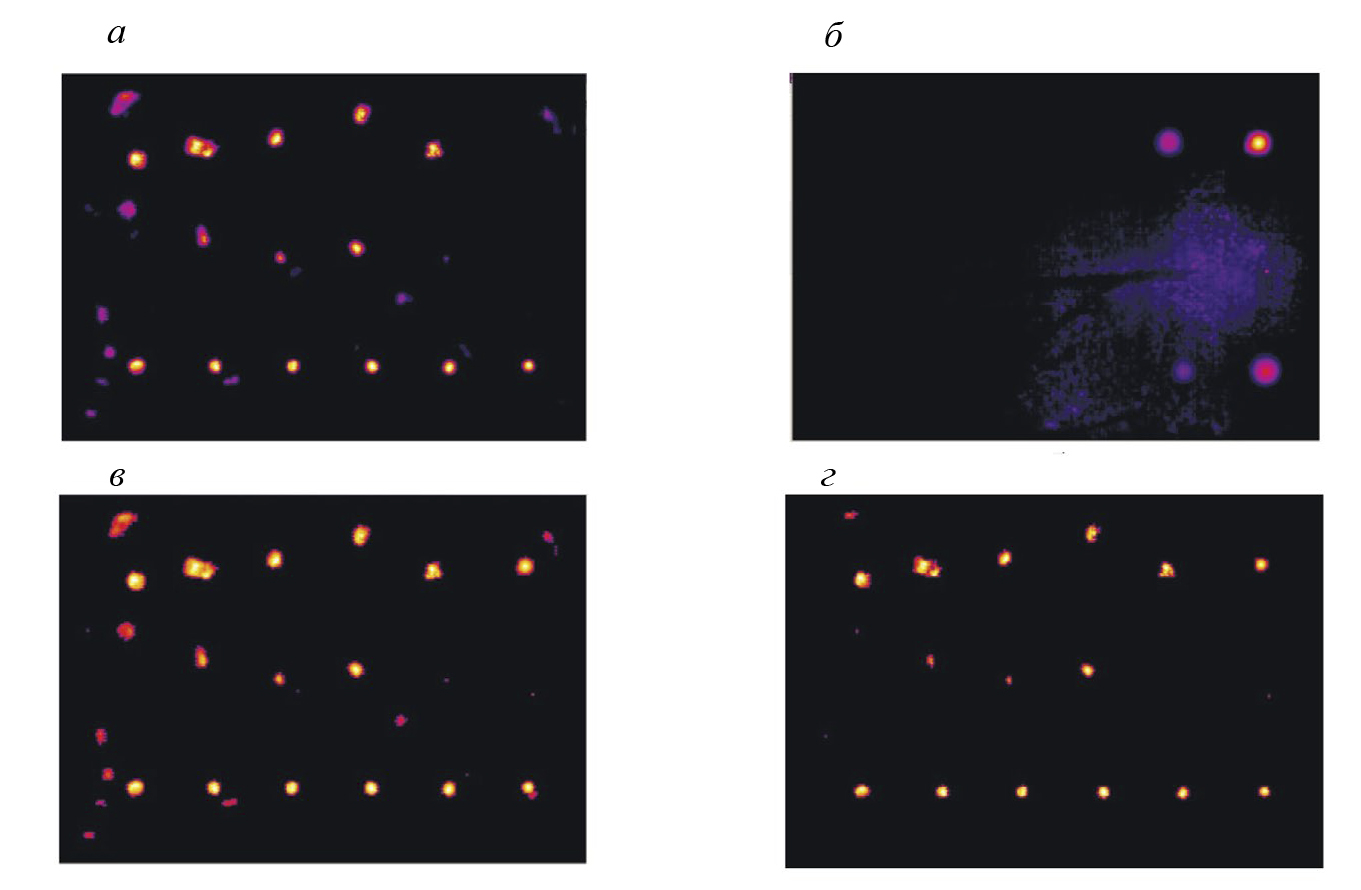 Рис. 8. Результаты синтеза данных при использовании алгоритма с введением порогов: синтез акустических изображений (а); синтез ИК-термограмм (б); синтез акустических изображений и ИК-термограмм без шумоподавления (в); синтез акустических изображений и ИК-термограмм при введении порогов подавления шумов (г).