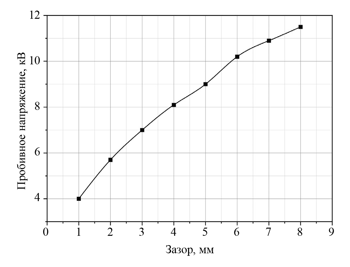 На основе данных, полученных из осциллограмм, определены пробивные напряжения при различных межэлектродных зазорах (рис. 4).