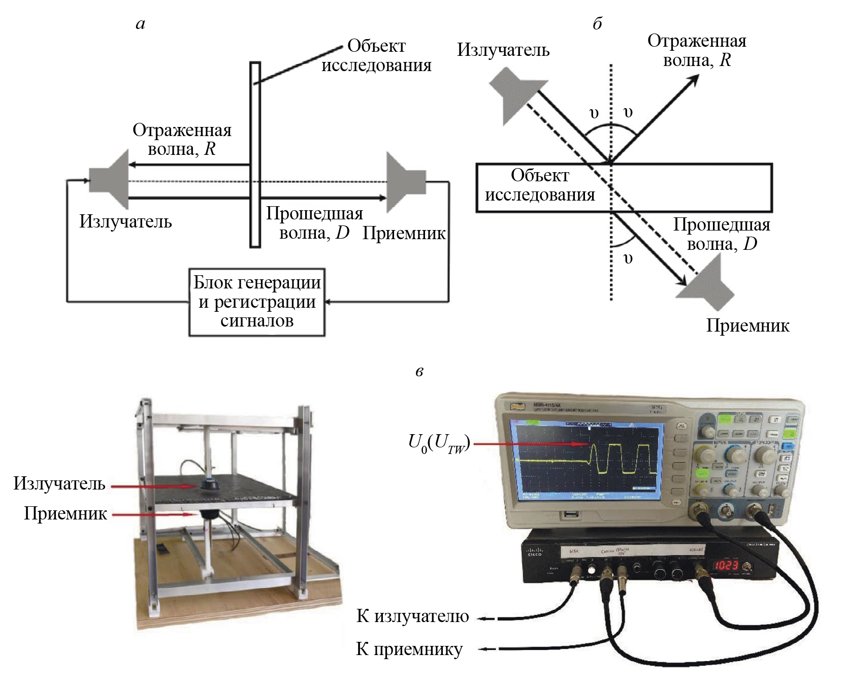 При исследованиях использована методика оценки коэффициента прохождения акустических волн через пористые листовые материалы, основанная на использовании низкочастотного амплитудно-теневого метода (Патент № 2796231). Методика реализована на базе установки для контроля пористых материалов, входящей в состав уникальной научной установки (УНУ) “Информационно-измерительный комплекс для исследований акустических свойств материалов и изделий”, и бесконтактных акустических пьезопреобразователей. Акустические преобразователи обеспечивают эффективное излучение и прием волн через воздух за счет эффекта изгибных колебаний пьезопластин, согласование которых с низким импедансом воздуха — наилучшее. Блок-схема и фото экспериментальной установки представлены на рис. 1.