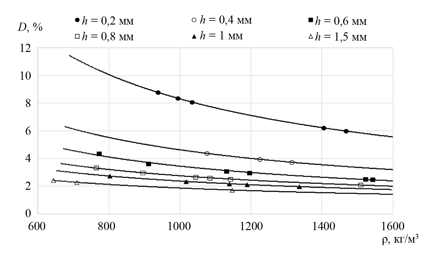 Рис. 2 иллюстрирует семейство кривых, описывающих влияние плотности исследованных образцов листов ТРГ различной толщины на коэффициент прозрачности. Закономерно уменьшение коэффициента прозрачности как с увеличением плотности, так и с увеличением толщины листа. Степень влияния плотности (крутизна кривых) снижается по мере увеличения толщины листа. При этом совместный учет влияния обоих параметров на коэффициент прозрачности не представляется возможным.