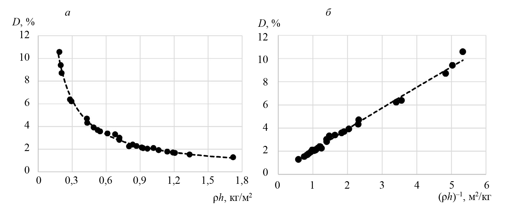 Введем вспомогательную обобщенную характеристику листа, определяемую произведением плотности образца на его толщину, или его поверхностную плотность ρh. Результаты исследования коэффициентов прозрачности для 28 образцов показали наличие однозначной обратнопропорциональной зависимости от произведения плотности образца на его толщину или его “поверхностной плотности” ρh (рис. 3а). Полученные зависимости могут быть преобразованы в линейные зависимости коэффициента прозрачности от обобщенного параметра (ρh)–1 (рис. 3б).