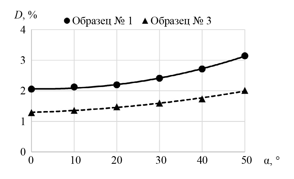 Результаты исследования влияния угла наклона акустической оси относительно плоскости образца (рис. 4) показали, что в диапазоне изменения углов от 0 до 50 град коэффициент прозрачности меняется на 53 % для образца № 1 и на 59 % для образца № 3. При этом на малых углах (до 10 град) влияние угла менее существенно (3 % для образца № 1 и 5 % для образца № 3).