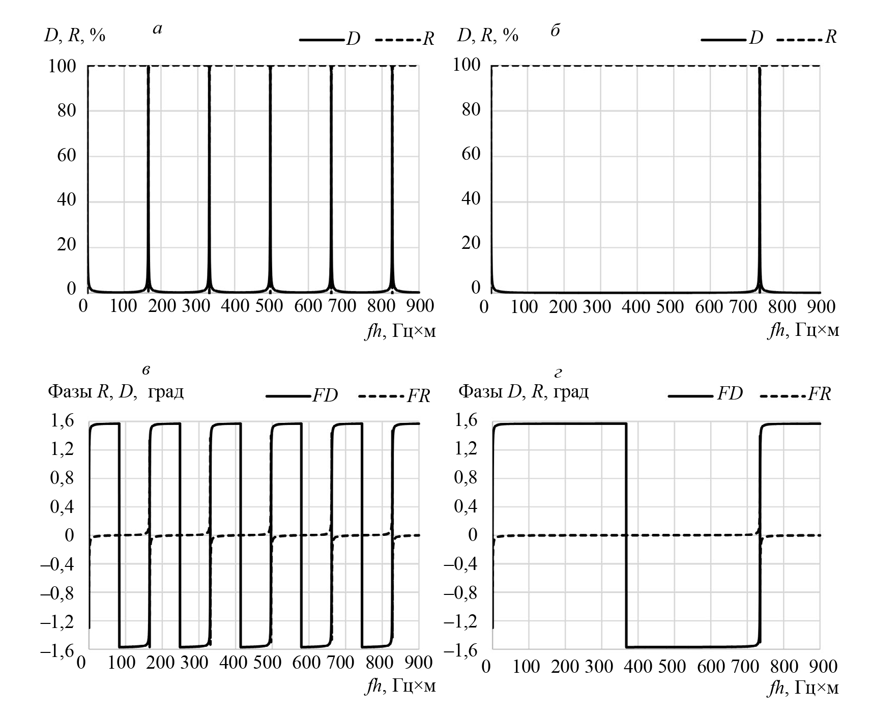 Рис. 6. Зависимость амплитуд (а, б) и фаз (в, г) коэффициентов прозрачности D и отражения R от fh для образца № 1 при скорости C2 = 330 м/с (а, в) и скорости C2 = 1470 м/с (б, г)