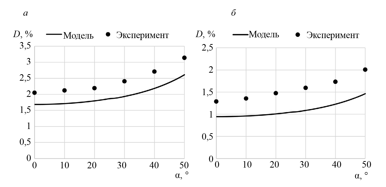 При определении коэффициента прозрачности через тонкие листы важно оценить влияние углового перекоса листа относительно акустической оси, что определяет достоверность контроля плотности листа. С этой целью теоретически исследовано влияние угла падения α акустической волны на тонкий лист на примере двух образцов фиксированной толщины (1,5 мм) и разной плотности (643 и 1147 кг/м3). Представленные на рис. 9 зависимости коэффициента прозрачности от угла падения показывают, что значение D увеличивается с ростом угла, при этом в области малых углов изменение D не существенно (не превышает 2 % в диапазоне углов от 0 до 10 град) и более существенно для больших диапазонов углов: при угле 50 град отклонение коэффициента прозрачности может достигать 35 % от начального значения (0 град).