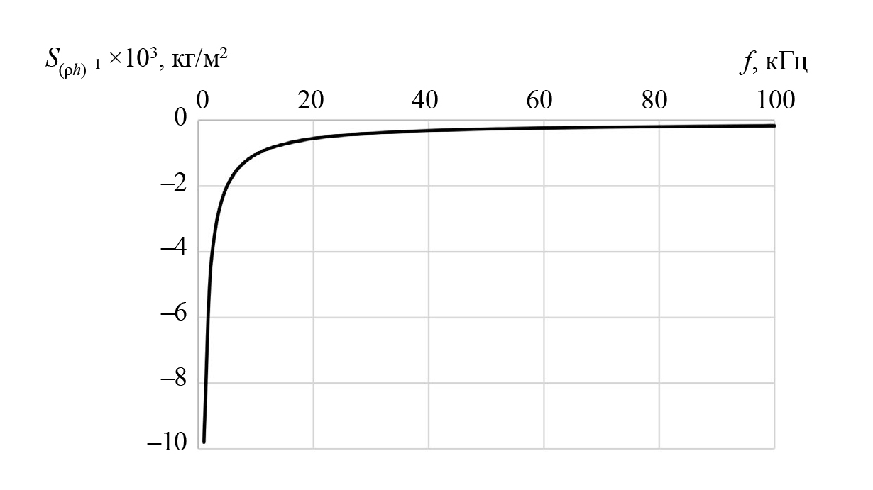 При использовании обобщенного параметра (ρh)–1 чувствительность является величиной постоянной и зависит только от частоты. Влияние частоты на чувствительность коэффициента прозрачности к величине (ρh)–1 иллюстрирует рис. 11. Расчеты показывают, что для частоты 6,5 кГц чувствительность кг/м2.