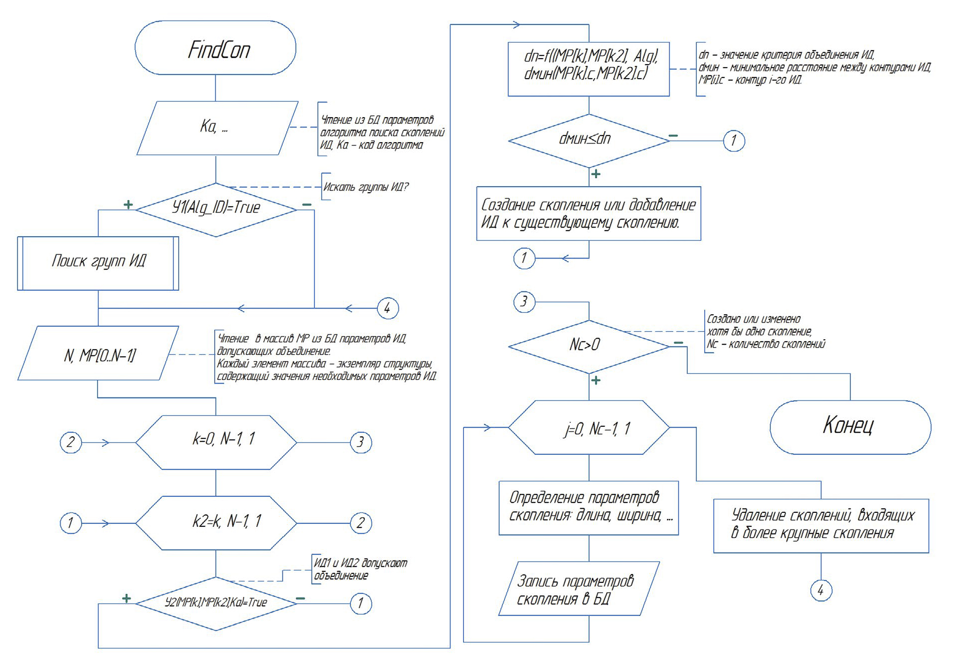 - Формирование ГИД, если это предусмотрено выбранным критерием. При этом организуется два вложенных цикла, в которых перебираются все пары ИД. Для каждой пары ИД вычисляются Lijmin, (см. табл. 1). Если Lijmin < , то создается или изменяется ранее созданная ГИД. ИД, образующие группу, помечаются как элементы ГИД и в дальнейшем не рассматриваются. После завершения циклов поиска для каждой ГИД: определяется ее контур и параметры, необходимые для дальнейшей обработки (максимальный размер, максимальная ширина и др.); вычисляются координаты прямоугольника, в который вписывается контур ГИД. В свою очередь, обнаруженная ГИД рассматривается как новое отдельное ИД.