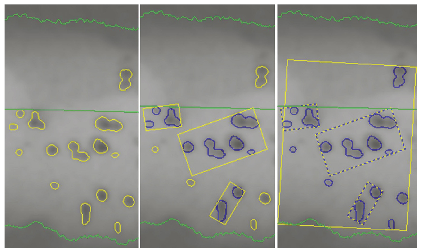 На рис. 4а представлен фрагмент радиографического изображения сварного соединения с ИД, которые классифицированы как включения. На этом рисунке контуры ИД выделены желтым цветом, а зеленым цветом обозначены границы сварного соединения. На рис. 4б приведен тот же фрагмент, но после выполнения операции поиска ГИД. На этом рисунке контуры ИД, образующие ГИД, выделены синим цветом, а отдельные ИД и прямоугольники, описанные вокруг ГИД, — желтым цветом. Длины большей и меньшей сторон описанных прямоугольников являются соответственно максимальным размером и максимальной шириной ГИД. На рис. 4в приведен тот же фрагмент, но после последовательного выполнения операций поиска ГИД, а затем СИД. На этом рисунке: контуры ИД, образующие СИД, выделены синим цветом; прямоугольники, описанные вокруг ГИД, включенных в СИД, — сине-желтым пунктиром; прямоугольники, описанные вокруг СИД, — желтым цветом. Длины большей и меньшей сторон, описанных вокруг СИД прямоугольников являются соответственно максимальным размером и максимальной шириной СИД. В приведенном примере обнаруженные ГИД и СИД соответствуют определениям групп и скоплений включений, данным в НД НП-105-18 и ГОСТ 23055—78.