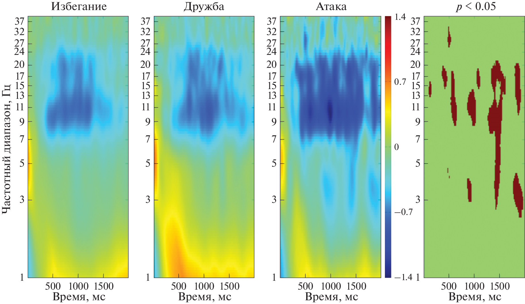 The aim was to study the oscillatory dynamics accompanying the processes of interaction with the virtual character and the localization of the revealed effects. 42 subjects (of which 25 are women) aged 18 to 41 years took part in the study. During the EEG recording, the subjects had to interact with the virtual character by choosing one of three options (“offer friendship”, “attack” or “avoid contact”). Faces with 5 types of emotional expressions (angry, happy, frightened, sad and neutral) were used. An analysis of equivalent dipoles revealed that the choice of active interaction (to attack or offer friendship), compared with the avoidance of interaction, was accompanied by a large decrease in α- and β-rhythms, which may be associated with the processes of understanding the virtual character’s intentions. The choice of friendship versus avoidance of interaction was accompanied by an increase in δ-rhythm, which may indicate the presence of a motivational component. The revealed effects were found in clusters of equivalent dipoles, the localization of which coincides with the structures of the mentalization network and the network of mirror neurons involved in the processes of people’s intent assessment.