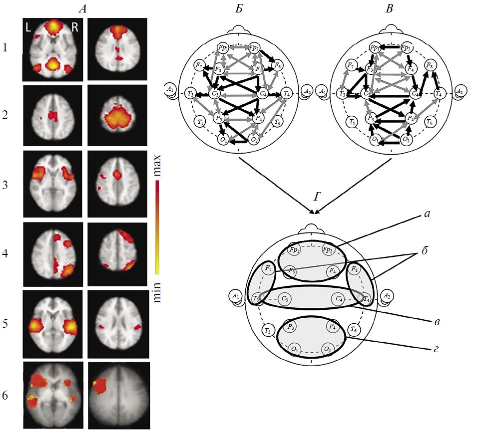 А — усредненные по группе испытуемых RSN фМРТ: 1 – DMN, 2 - сенсомоторная, 3 – сеть управляющих функций (исполнительного контроля), 4 – лобно-теменная, 5 – слуховая, 6 – речевая. Шкала справа характеризует уровень максимальной интенсивности сети. Б, В — усредненная в этой же группе испытуемых коннективность ЭЭГ по корреляции Пирсона. Черные линии — однонаправленные связи, серые — двунаправленные, согласно методу причинности Грейнджера. Б — коннективности, рассчитанные на непрерывных записях, В — в режиме псевдо-ВП. Г — зоны концентрации функциональных связей ЭЭГ: а — лобные, б — височно-передневисочные, в — центральные, г — затылочно-теменные.