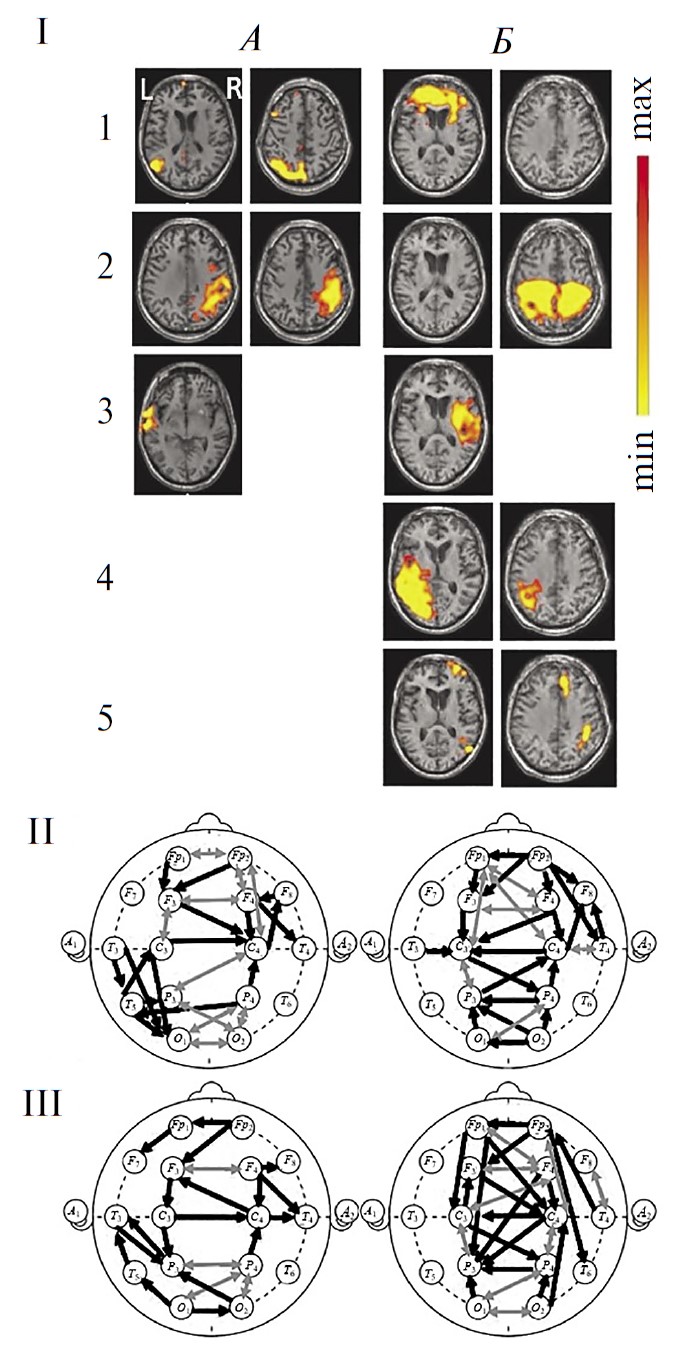 3. Рис. 2. Динамика сетей покоя функциональной магнитно-резонансной томографии (фМРТ) и коннективности ЭЭГ-диапазона 1–15 Гц в наблюдении 1. A — исследование 1 (до ритмической транскраниальной магнитной стимуляции (рТМС)), вегетативное состояние; Б — исследование 2 (через 5 дней после курсовой рTMС), состояние, переходное к мутизму с пониманием речи. I — RSN фМРТ: 1 – DMN, 2 – сенсомоторная, 3 – слуховая, 4 – речевая, 5 – лобно-теменная. Шкала справа как на рис. 1. II — коннективность ЭЭГ покоя в непрерывной записи. III — коннективность ЭЭГ покоя в режиме псевдо-ВП. Обозначения линий см. рис. 1.