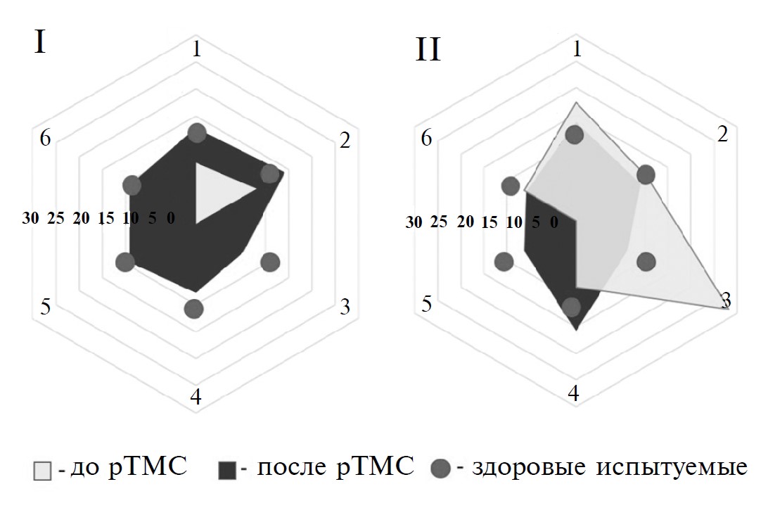 4. Рис. 3. Показатели максимальной интенсивности сетей покоя функциональной магнитно-резонансной томографии (фМРТ) здоровых испытуемых и пациентов с ТЧМТ. I — динамика интенсивности в наблюдении 1, II — в наблюдении 2. Серые точки — значения этого показателя в группе здоровых испытуемых. Сети покоя фМРТ: 1 – DMN, 2 – сенсомоторная, 3 – сеть управляющих функций (исполнительного контроля), 4 – лобно-теменная, 5 – слуховая, 6 – речевая.