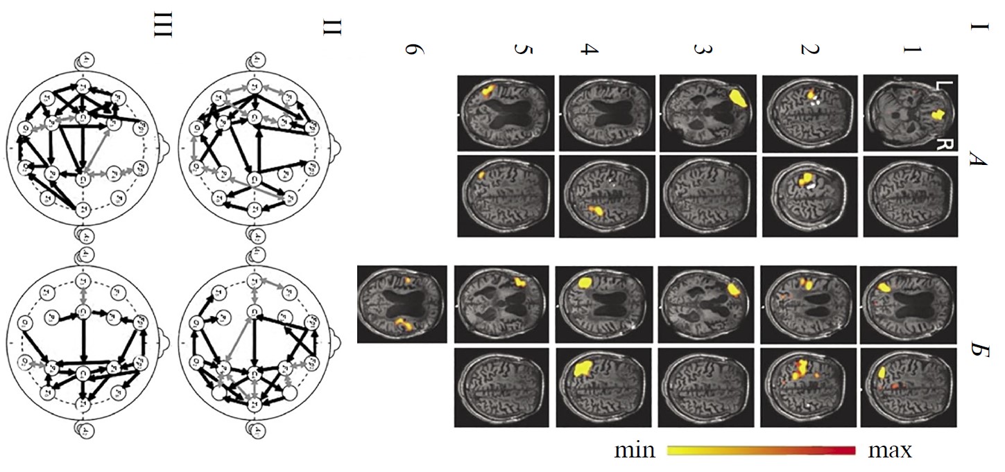 Во втором исследовании и в непрерывных записях ЭЭГ (рис. 2, Б, II), и в режиме псевдо-ВП (рис. 2, Б, III) наблюдается увеличение числа межполушарных связей ЭЭГ лобно-центральных и затылочно-теменных областей. Эти изменения согласуются с восстановлением билатеральной структуры сетей управляющих функций и сенсомоторной фМРТ покоя (рис. 2, Б, I, 1-2). Кроме того, выявляются двухсторонние внутриполушарные лобно-центральные коннективности ЭЭГ. В режиме псевдо-ВП более отчетливо выражено увеличение числа протяженных внутриполушарных взаимодействий: лобно-теменной слева, а также лобно-височных и затылочно-центральной справа. Перестройки внутриполушарных связей ЭЭГ согласуются появлением компонентов правой лобно-теменной, а также речевой сетей фМРТ покоя.