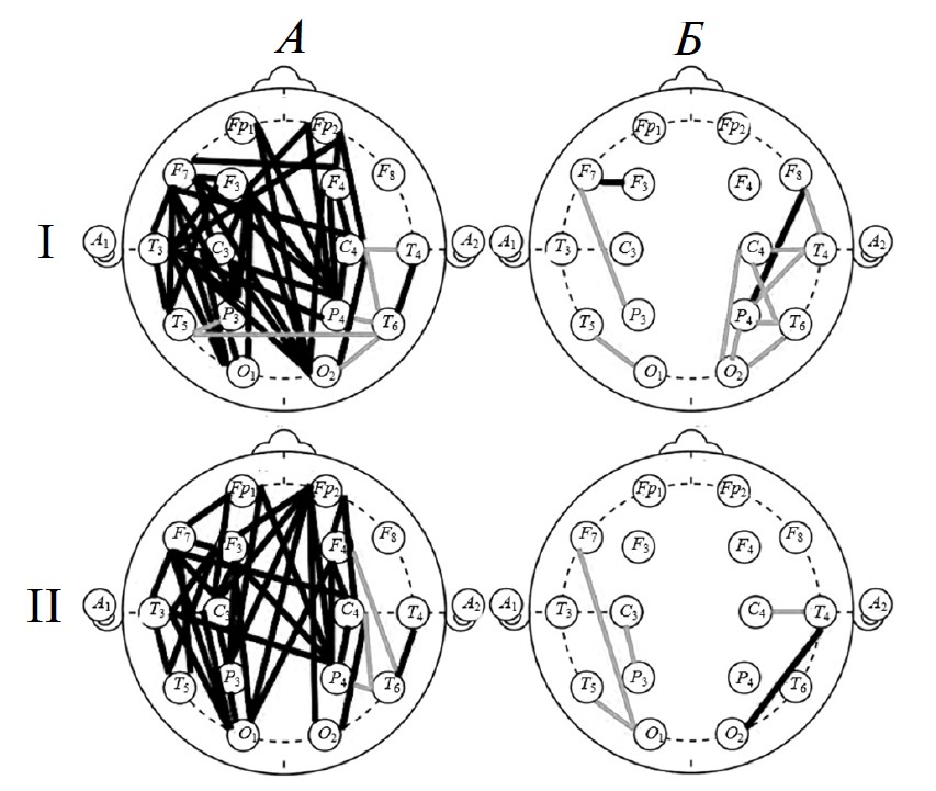 6. Рис. 5. Коннективности ЭЭГ покоя, значимо изменяющиеся после курсовой ритмической транскраниальной магнитной стимуляции (рТМС) в индивидуальных наблюдениях пациентов с посттравматическим угнетением сознания. I — различия связей непрерывных реализаций ЭЭГ; II — различия связей в режиме псевдо-ВП. А — наблюдение 1, Б — наблюдение 2. Черные линии — коннективности ЭЭГ, усиленные после рТМС по сравнению с состоянием до стимуляции, серые линии — ослабленные. Различия оценены посредством коэффициентов корреляции Пирсона. У пациента 1 (А) – критерий Вилкоксона, FDR, p < 0.01. У пациента 2 (Б) – критерий Вилкоксона, FDR, p < 0.05.