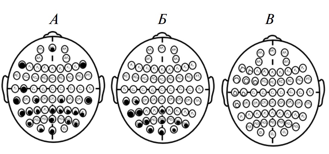 ЭИ1 (позитивная экспрессивность) и θ1 (А) или β1 (Б) и ЭИ7 (эмпатия) и β1 (В); темные кружки обозначают отведения, для которых обнаружена положительная корреляция, пустые — отрицательная; их размер соответствует устойчивости связи: 0.01 < p < 0.1.
