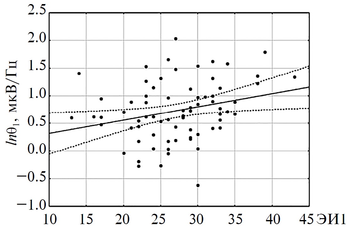 Показатели Кпэ/нэ и ЭИ2 характеризуются связью как с низкочастотными, так и с высокочастотными ритмами и объясняют от 5 до 13% их дисперсии. Повышению Кпэ/нэ соответствует увеличение мощности θ1-, α2-, β1- и β2-колебаний. По-видимому, больший вклад в изменения мощности этих ритмов вносит ЭИ2, вызывая их снижение (за исключением α2), тогда как ЭИ1 оказывает положительное влияние только на β1, причем на уровне тенденции (табл. 2).