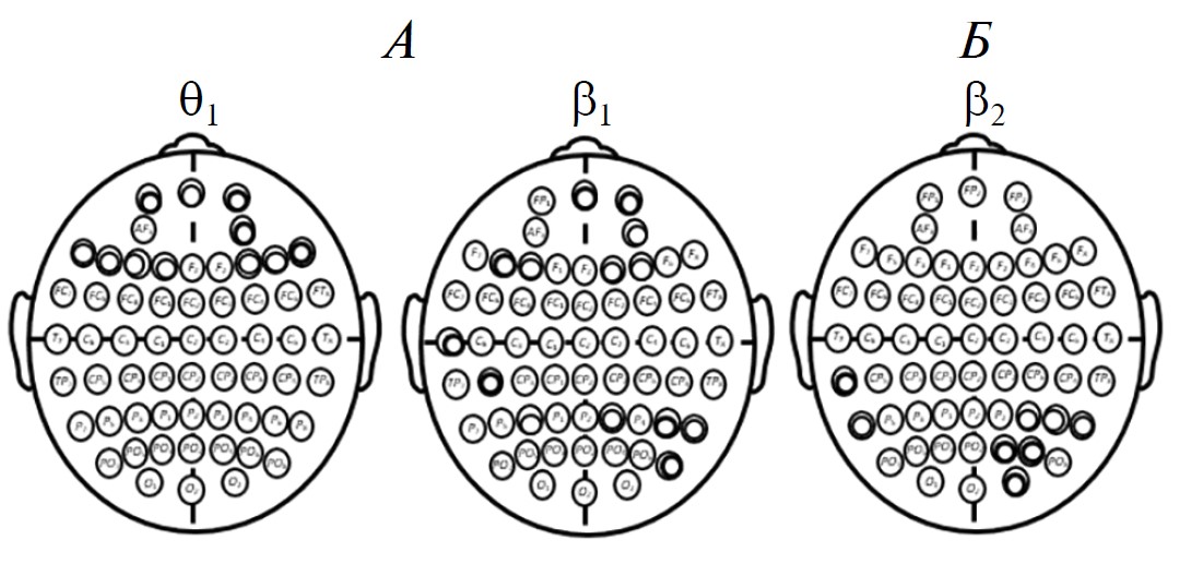 Для каждого пациента с использованием быстрого преобразования Фурье вычисляли мощность биопотенциалов ЭЭГ в шести частотных диапазонах: θ1 (4–6 Гц), θ2 (6–8 Гц), α1 (8–10 Гц), α2 (10–13 Гц), β1 (13–20 Гц), β (20–30 Гц). Более подробное описание анализа ЭЭГ приведено в работе [40].