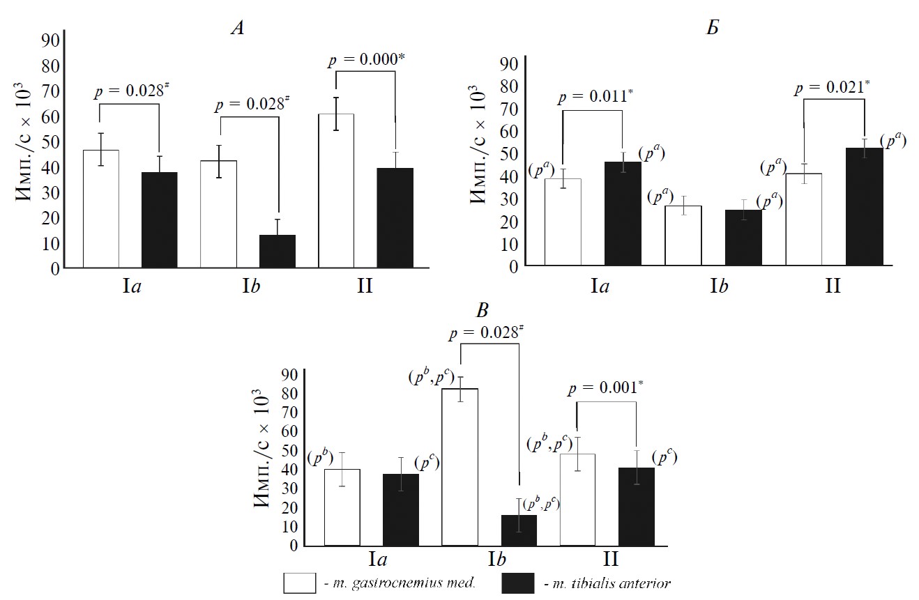 4. Fig. 3. Changes in the impulse activity of afferents Ia, Ib and II of groups GM and TA during walking. A - walking without stimulation; B — walking during stimulation; B - walking after stimulation. (pa), (pb) – significantly significant differences in indicators obtained during and after transcutaneous electrical stimulation of the spinal cord (TESCS) compared with indicators without stimulation; (pс) – reliably significant differences between indicators during and after TESCM; * – One-way Anova with post-hoc Newman-Keuls analysis; # – Mann-Whitney U Test.
