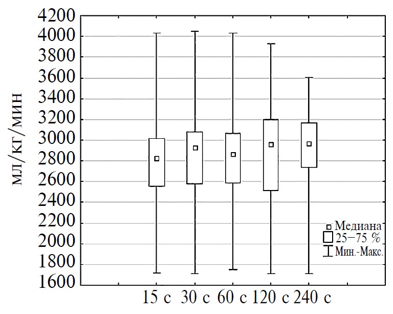 Максимальное потребление кислорода и время теста. Из 65 планируемых измерений удалось получить только 63. Для построения графиков и анализа отличий утраченные данные были заменены на среднее значение из результатов других тестов, которые выполнил тот же испытуемый. МПК для тестов с продолжительностью нагрузочной ступени 15, 30, 60, 120 и 240 с составило 2865 ± 630, 2894 ± ± 603, 2855 ± 588, 2910 ± 611 и 2895 ± 506 мл/мин соответственно. Значения каждого протокола не имели значимых различий между собой (табл. 1).