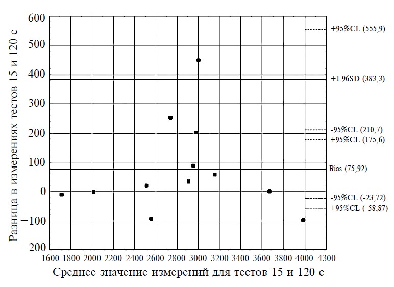 Из рис. 2 видно, что средняя разница между измерениями в двух тестах равна –76, что составляет всего лишь 2% от значения измеряемой величины. Отсутствует зависимость разницы двух тестов от величины измеряемого параметра. Большая часть различий между двумя тестами попадает в доверительный интервал. На рис. 2 виден лишь один значительный выброс, который может быть объяснен состоянием участника эксперимента. Анализ теста других экспериментов свидетельствует, что при длительности ступени 15 с получен не характерный для него результат. Таким образом, график Блэнда-Альтмана иллюстрирует эквивалентность результатов, полученных в тестах с продолжительностью нагрузочной ступени 15 и 120 с.
