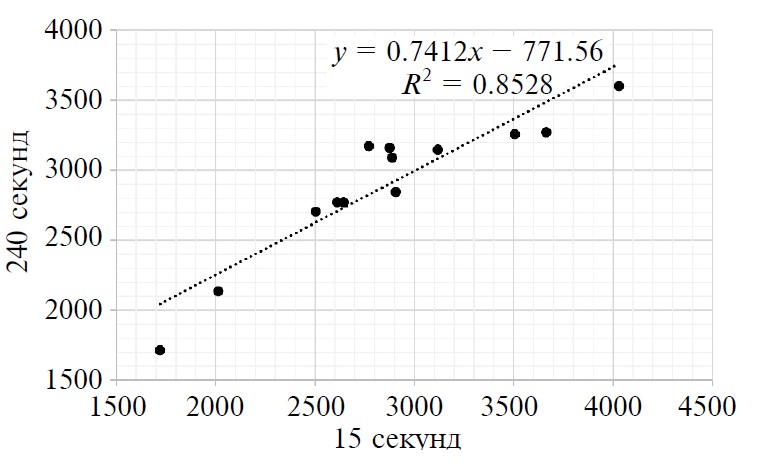 Взаимосвязь значений МПК в разных протоколах. На рис. 3 показана взаимосвязь индивидуальных показателей МПК, полученных в тестах с самой короткой (15 с) и с самой длинной (240 с) нагрузочной ступени. Найдена сильная прямая взаимосвязь (r = 0.92), зависимость статистически значима (p < 0.01).