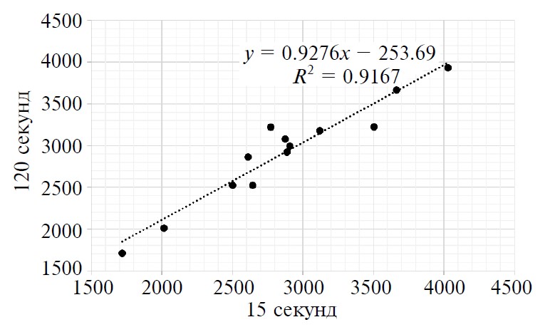 На рис. 4 показана взаимосвязь индивидуальных показателей МПК, полученных в тесте с самой короткой (15 с) и с наиболее часто применяемой в диагностике (120 с) нагрузочной ступени. Найдена сильная прямая взаимосвязь (r = 0.95), зависимость статистически значима (p < 0.01).
