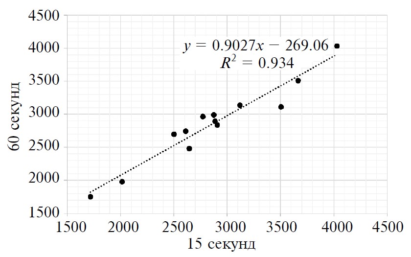 На рис. 5 показана взаимосвязь индивидуальных показателей МПК, полученных в протоколах с длительностью ступени 15 и 60 с. Найдена сильная прямая взаимосвязь (r = 0.96), зависимость статистически значима (p < 0.01).