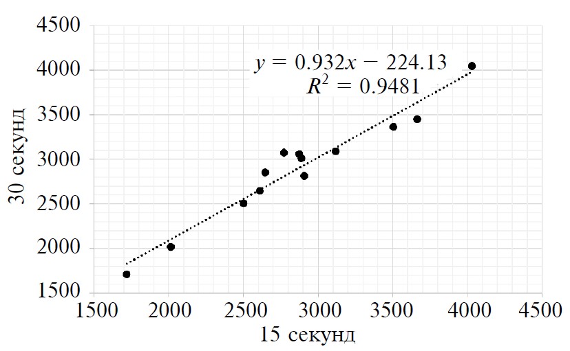 На рис. 6 показана взаимосвязь индивидуальных показателей МПК, полученных в протоколах с длительностью ступени 15 и 30 с. Найдена сильная прямая взаимосвязь (r = 0.97), зависимость статистически значима (p < 0.01).