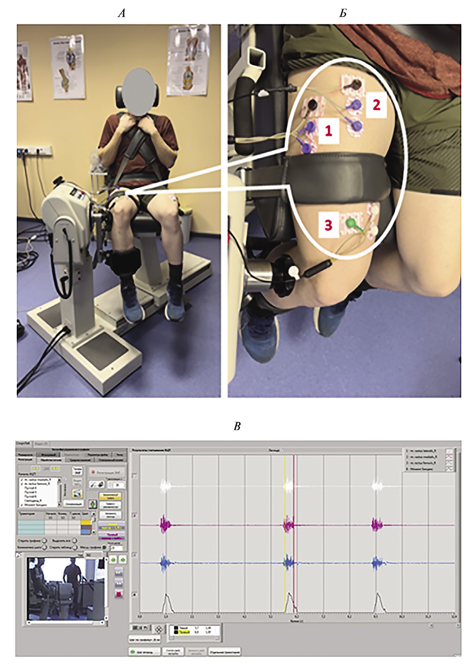 А — положение испытуемого в кресле динамометра; Б — расположение электродов для регистрации ЭМГ мышц передней поверхности бедра. 1 – m. vastus lateralis, 2 – m. rectus femoris, 3 – m. vastus medialis; В — результаты тестирования, пример распечатки с монитора ПАК “СпортЛаб”.