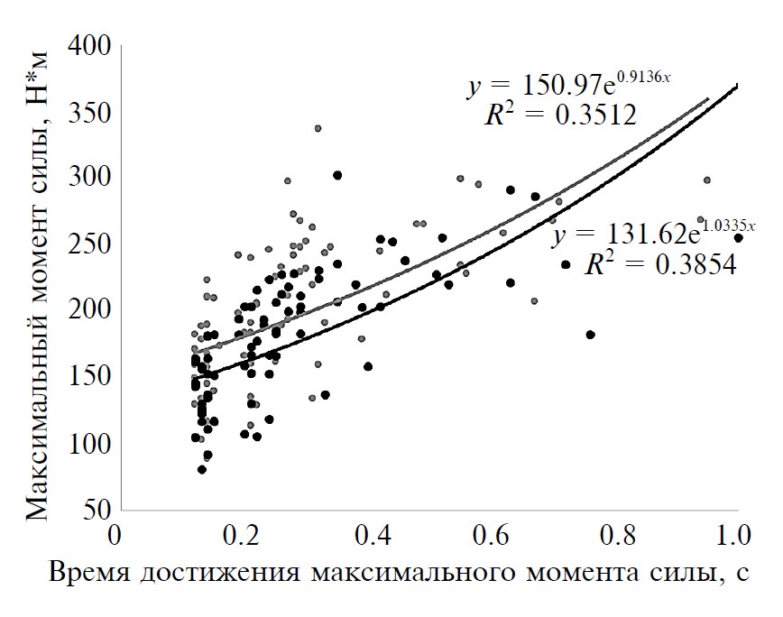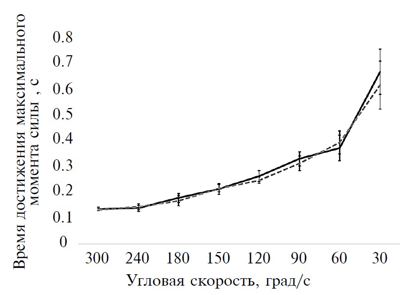 Слово “скорость” употребляется для обозначения не только быстроты изменения положения тела или его частей в пространстве, но и для характеристики так называемых “взрывных усилий”, к которым можно отнести и наше тестирование на изокинетическом динамометре. Скорость нарастания силы — градиент силы, особенно важен при изучении движений, где необходимо проявлять большую силу в возможно более короткое время. В самом упрощенном виде градиент силы определяется по наклону кривой “сила-время” [19, 20]. Таким образом, если после 21-суточной АНОГ происходило снижение максимальной произвольной силы, отраженное в снижении максимального момента силы, то логично предположить, что при изменении времени достижения максимального момента силы произойдут изменения зависимости “сила-время” после 21-суточной АНОГ.