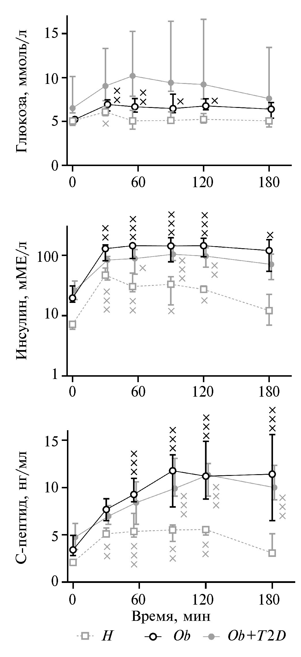 Рис. 1. Динамика глюкозы, инсулина и С-пептида в крови после приема смешанной пищи (6 ккал/кг массы тела) у худых добровольцев (Н), пациентов с ожирением без (Ob) и с сахарным диабетом 2-го типа (Ob + T2D).